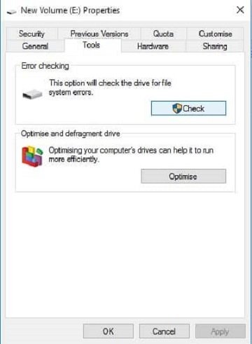 مرحله2. سپس، روی Properties کلیک کنید و تب ‘Tools’ را انتخاب نمایید. در زیر تب Tools، روی ‘Check’ در زیر Error checking کلیک کنید.