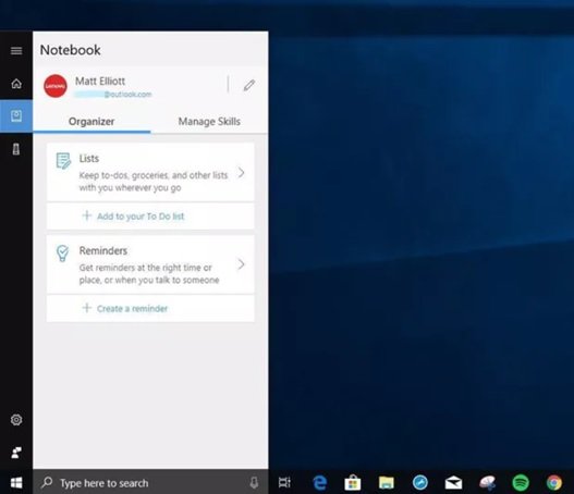 صفحه یادداشت کورتانا در بهروزرسانی بهاره ویندوز 10 متفاوت خواهد بود، بهطوری که یادداشتها و یادآوریها بر مبنای اولویتی که دارند به شما نشان داده خواهند شد. قابلیت جدید اضافه شده به صفحه یادداشت کورتانا دو زبانه جدید در اختیار شما قرار میدهد. زبانههایی که ناوبری را بیش از پیش ساده میکنند. در زبانه Organizer فهرستها و یادآوریها در بالا و مرکز قرار میگیرند تا کار شما را سادهتر کنند. سایر ابزارهای یادداشت در زبانه Manage Skills قرار دارند. ابزارهایی که اجازه میدهند به برنامههای کاربردی و دستگاههای هوشمند متصل شده و تنظیمات مربوط به تقویم را تغییر دهید. همچنین یک دکمه (آیکن) مداد در کنار زبانه Organizer قرار دارد که اجازه میدهد موقعیتهای مکانی را مشخص کرده تا هر زمان به لحاظ ترافیکی تغییری رخ داد از این موضوع مطلع شوید. ویژگی فوق جدید نبوده و در گذشته نیز وجود داشت. البته در بخش About دفترچه یادداشت کورتانا قرار داشت.