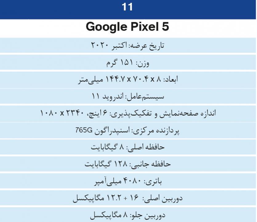 گوشی Google Pixel 5 ثابت کرد که یک مدل عالی و پرچمدار نباید بزرگ باشد. یک گوشی خوب باید مجهز به سیستمعامل و نرمافزارهای قابل اعتمادی باشد و حداقل جوابگوی یک روز کاری کامل باشد. گوگل در ساخت این گوشی از تراشه اسنپدراگون 765G استفاده کرده که مبتنی بر لیتوگرافی 7 نانومتری است. به همین دلیل مصرف انرژی کمی دارد. پردازنده مرکزی این گوشی 8 هستهای است که هسته اصلی با فرکانس 2.4 گیگاهرتز کار میکند. علاوه بر این، مجهز به پردازنده گرافیکی Adreno 620 است. پشتیبانی از فناوری 5G یکی از ویژگیهای شاخص این گوشی است. این گوشی گوگل از نظر حافظه اصلی تنها در یک نسخه 8/128 گیگابایتی وارد بازار شده و از کارت حافظه خارجی پشتیبانی نمیکند. در مجموع گوشیهای پیکسل از بهترینهای بازار هستند و بهدلیل اینکه مجهز به اندروید خام هستند و گوگل از آنها پشتیبانی کاملی بهعمل میآورد، مورد توجه کاربران قرار دارند.