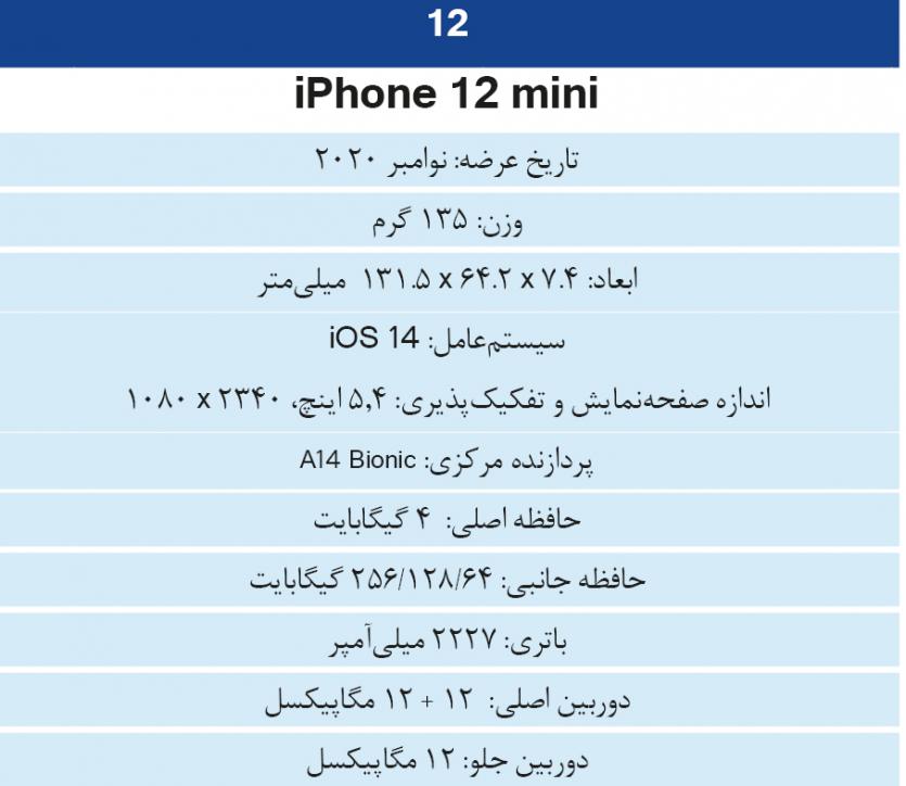 آیفون 12 مینی برای علاقهمندان به گوشیهای کوچک طراحی شده و صفحهنمایش نسبتاً کوچک 5.4 اینچی دارد و بهراحتی در جیب یا دست قرار میگیرد. این گوشی ویژگیهای فنی تقریبا یکسانی با آیفون 12 دارد. از جمله از پردازنده یکسانی استفاده میکند، مجهز به دوربینهای خوبی است و از فناوری 5G و همچنین MagSafe پشتیبانی میکند. با اینحال، در برخی موارد مشکلاتی دارد. اول آنکه باتری با ظرفیت کمی دارد و شارژ بیسیم آن آهسته است. با اینحال، اگر بهدنبال یک گوشی کوچک 5G هستید، این گوشی مناسبی است.