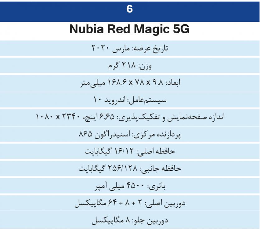 Nubia Red Magic 5G هر آنچه که از یک تلفن همراه گیمینگ نیازی دارید، در اختیارتان قرار میدهد. صفحهنمایشFHD+ AMOLED با نرخ نوسازی 144 هرتز، پردازنده قدرتمند همراه با رم فراوان و باتری بادوام با قابلیت شارژ سریع، تنها بخشی از ویژگیهای شاخص این محصول هستند. قلب تپنده این گوشی تراشه پردازشی اسنپدراگون 865 هشت هستهای است. 1 هسته 2.84 گیگاهرتز Kryo 585، 3 هسته 2.42 گیگاهرتز Kryo 585 و 4 هسته 1.8 گیگاهرتز Kryo 585 توان محاسباتی خوبی در اختیار این گوشی قرار میدهند. این گوشی قابلیت اتصال به شبکههای 5G را دارد که البته تنها محدود به شبکههای زیر 6 گیگاهرتز است و از نوع سریعتر موج میلیمتری پشتیبانی نمیکند.