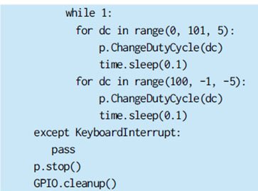 قدم بعدی این است که مشخص کنید پین یک خروجی تولید کند و سپس راهی برای خارج شدن از برنامه پیدا کند. در اینجا باز هم از کلاس GPIO استفاده و تابع PWM را فراخوانی کنید. این تابع دو پارامتر ورودی دارد. یکی شماره پین و دیگری مقدار فرکانس به هرتز که در اینجا 0.5 است.