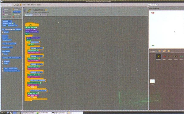 از قسمت Control حلقه ‘Forever’ را انتخاب کنید. سایر کدها در این حلقه قرار میگیرند. به Motion برگردید و ‘go to‘ را انتخاب کنید. روی ‘mouse-pointer’ کلیک کنید و به Pen برگردید و ‘pen up’ را انتخاب کنید و آن را زیر ‘go to‘ بگذارید (شکل 6).