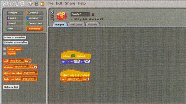 اسپرایت طبل را بارگذاری و ‘When clicked’ را انتخاب کنید. سپس، ‘Go to x:-150, y:100’ را وارد کنید. ‘When Sprite1 clicked’ را انتخاب کنید. در قسمت stop drum’ Variables’ را ایجاد کنید. ‘Set () to ()’ را انتخاب و ‘stop drum’ را بهعنوان متغیر و مقدار صفر را نیز وارد کنید (شکل 2).