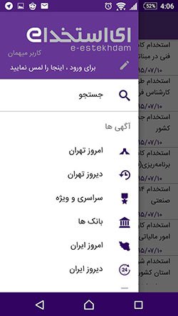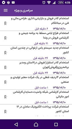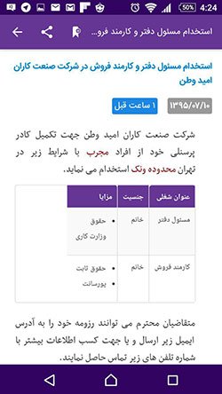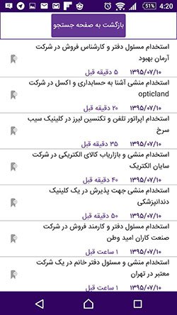 این اپلیکیشن برای سیستمعامل اندروید عرضه شده است و علاوه بر ظاهر گرافیکی بسیار خوب؛ امکان جستوجو و دریافت پیام جدیدترین آگهیهای استخدام براساس شهر و رشته به صورت نوتفیکیشن را دارد. این اپلیکیشن فقط برای کاریابی نیست و کارفرماها نیز میتوانند با ورود و ثبتنام در سامانه ویژه آن؛ به دنبال نیروهای کار مناسب و متخصص خود باشند.