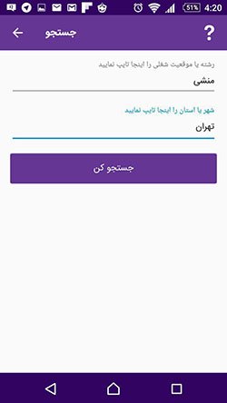 وقتی این اپلیکیشن را نصب میکنید؛ با منوی اصلی برنامه روبرو میشوید که امکان جستوجو در آگهیها را به شما میدهد. برای استفاده از این قابلیت حتما باید در سیستم ثبتنام رایگان کرده باشید. در هنگام ثبتنام میتوانید رشته یا موقعیت شغلی را به همراه شهر و استان محل درخواست وارد و برایناساس در آگهیهای استخدامی جستوجو انجام شود.