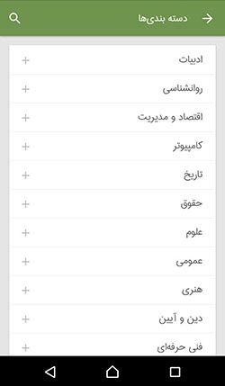 این اپلیکیشن دستهبندی کتاب بسیار گسترده و متنوعی دارد، به طوری که غالب نیازمندی و ذائقه مخاطب را پوشش میدهد. این دستهبندی کمک میکند زودتر به کتابهای دلخواه خود برسید. در این دستهبندی مجله و کتابهای کمک درسی و آموزشی نیز دیده میشود.