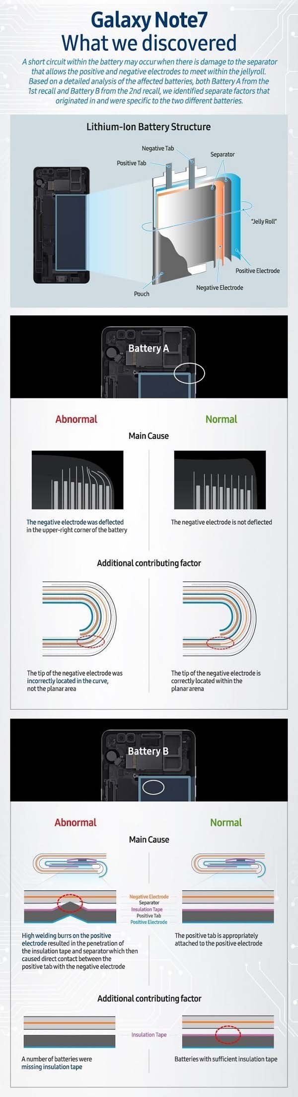 سامسونگ اشاره کرد که مشکل باتری نسخههای تعویض شده فبلت نوت 7 تعویض شده مربوط به جوشکاریهای ریزبخشهای مختلف باتری میشد و همچنین برخی از باتریهای نوت 7 هم نوار عایق نداشتند! سامسونگ اشاره کرد که برای بررسی این موضوع و دستیابی به نتایجی که هم اکنون عنوان شدند، بیش از 700 نفر از متخصصین خود را به کار گرفته است. سامی همچنین اشاره دارد که بررسی موضوع را به سه شرکت دیگر هم واگذار کرده و آنها هم نتایج مشابهی را به دست آوردند. رئیس بخش ایالات متحده سامسونگ اشاره کرد:
