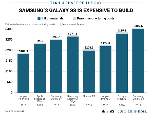 طبق نموداری که منبع تحلیلی استتیستا ارائه کرده است، هزینه تولید آیفون 6 اس اپل برابر با 187.9 دلار بوده است، حال آنکه سامسونگ برای تولید یک دستگاه گلکسی اس 7 باید هزینهای در حدود 255.1 دلار را صرف میکرد. با توجه به اطلاعاتی که از سوی این منبع ارائه شده، میتوان به این نتیجه رسید که افزایش قیمتی که سامسونگ برای گلکسی اس 8 در نظر گرفته قابل تایید و منطقی است.