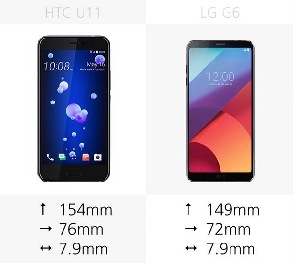 هر دو گوشی نام برده شده بدنهای با ضخامت 7.9 میلیمتر دارند. اما از نظر عرضه و ارتفاع گوشی الجی جی 6 از اچتیسی یو 11 کوچکتر است. این موضوع در حالیست که این گوشی از نمایشگر بزرگتر هم بهره میبرد. پس جای شکی وجود ندارد که پرچمدار الجی از نظر ابعاد نسبت به اچتیسی یو 11 طراحی دقیق و ظریفتری دارد.