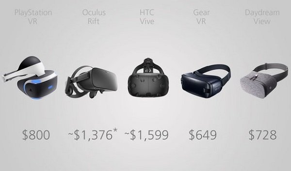 کامپیوترهایی که دو هدست اکولوس ریفت و اچتیسی وایو به عنوان منبع به آن نیاز دارند، حداقل قیمتی در حدود 500 دلار خواهند داشت. گوشیهای سری گلکسی که هدست گیر وی آر سامسونگ هم با آنها سازگار است، قیمتی در حدود 550 دلار را ارائه میکنند. همچنین گوشیهایی که هدست واقعیت مجازی دیدریم با آنها همگام میشود هم قیمتی در حدود 649 دلار خواهند داشت.