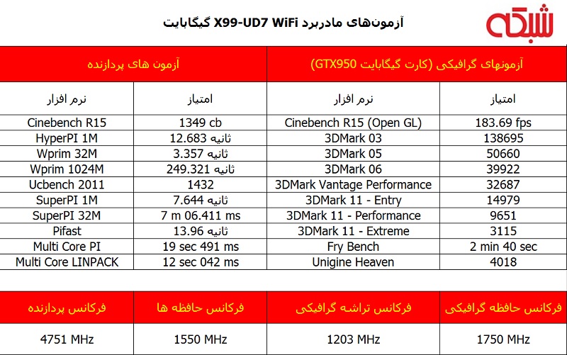 برای رسیدن به نتایج قطعی و قابل لمس نیاز است تا مادربرد در بخش های پردازنده و گرافیک تحت فشار نرم افزارهای آزمون کننده قرار گیرد. اما قبل از شروع تستها، مادربرد را از جنبه قابلیت اورکلاکینگ محک زدیم. باور کنید فکر نمی کردم که پلتفرم X99 با مادربرد گیگابایت تا این حد در عملیات اورکلاکینگ پردازنده منعطف و پایدار باشد. کار افزایش فرکانس را با افزایش ضریب مالتی پلیر پردازنده Core i7 5930k آغاز کردیم و طی دو مرحله، فرکانس پردازنده را با خنک کننده آبی به عدد 4800 مگاهرتز رسانده و اولید این فرکانس با نرم افزار CPU-Z انجام شد! ولتاژ اعمال شده به هسته ها و بخشهای دیگر پردازنده در این فرکانس 1.339 ولت در نظرگرفته شد که برخی از تستها با همین ولتاژ انجام شد، اما با ایجاد ناپایداری پردازنده در تست Cinebench R15 مجبور شدیم تا ولتاژ پردازنده را به عدد 1.354 ولت برسانیم تا مشکل کمبود ولتاژ رفع گردد. در نهایت فرکانس 4751 مگاهرتز را اعمال و تمامی آزمون های پردازشی و گرافیکی بدون ناپایداری و به راحتی اخذ شدند.