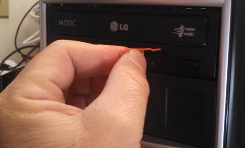 3- به نظر میرسد دیسکخوان سیستم شما با زبان مهربانی آشنا نیست. پس نیاز است تا کمی قاطعیت و زور را چاشنی کار خود کنید! کامپیوتر را خاموش و از قطع جریان برق آن مطمئن شوید. یک کلیپس آهنی (گیره نگهداری کاغذ) را باز کنید تا شکل آن به یک میله صاف تغییر کند. سپس این کلیپس را وارد سوراخ کوچکی که درست زیر درب درایو اپتیکال و سمت راست قرار دارد، وارد کرده و به سمت داخل فشار دهید. با این عمل، درب درایو اپتیکال آزاد شده و با کمی فشار و بیرون کشیدن درب، می توانید دیسک محبوس شده را از بند دیسکخوان آزاد کنید.