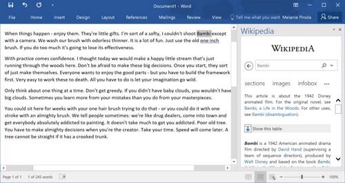 افزونه Wikipedia منابع مرجع را درون وُرد یا اکسل اضافه میکند تا برای جستجوی یک موصوع لازم نباشد بین پنجرهها رفت و آمد کنید. وقتی به Insert > My Add-ins بروید و افزونه Wikipedia را اضافه کنید، قادر خواهید بود متنی را در سند یا صفحهگستردهتان انتخاب و نتایج جستجوی Wikipedia را در کنار پنجره مشاهده کنید. اگر میخواهید در سندتان از Wikipedia نقل قول کنید کافی است محتوای پنل کناری را انتخاب و آن را در فایل خود قرار دهید. این افزونه برای محققین و دانشآموزان بسیاری کاربردی است.