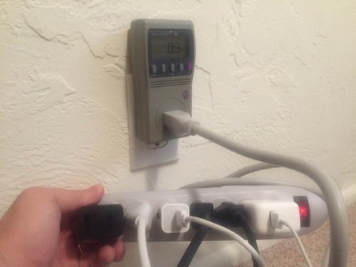خیلی دقیق نیست که بگوییم هر شارژر 0 وات برق مصرف میکند. هر شارژر در حال مصرف کسری از وات است و بالاخره باید قابل تشخیص باشد. با این تفاسیر، یک ایده جدید به ذهنمان خطور کرد. اینکه چند شارژر را به یک چندراهی برق متصل کنیم. حالا میبینیم چند شارژر لازم است تا بحدی برق بکشند که برای مصرفسنج قابل تشخیص باشد.