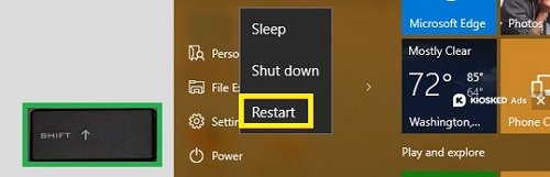 - در ویندوز 10، بر روی کلید Start و Power کلیک کنید. سپس کلید Shift را نگه دارید تا بتوانید کلید Restart را انتخاب کنید.