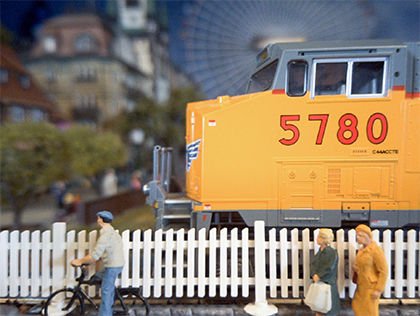 الف: تصویری که با حسگرهای دولایه رایج تهیه شده است. در این عکس، جلوی قطار کمی خمیده که نتیجه اعوجاج حاصل از حرکت سریع قطار است.
