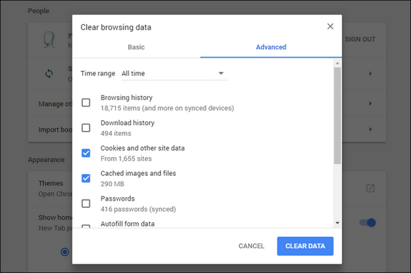 حافظه کش و کوکیهای مرورگر را پاک کنید