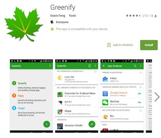 Greenify اولین برنامه فهرست ما است. این برنامه به سادگی میتواند طول عمر باتری گوشی را افزایش دهد. این برنامه میتواند برنامههای پسزمینه را به خواب زمستانی ببرد. Greenify گزینهای در اختیار شما قرار میدهد که از طریق آن میتوانید برنامهها را به خواب زمستانی برده و دومرتبه از خواب زمستانی خارج کنید. برنامههایی که در پسزمینه اجرا میشوند به راحتی میتوانند باتری گوشی را خالی کنند، در نتیجه نباید به سرویسهایی که هیچگاه از آنها استفاده نمیکنید اجازه دهید در پسزمینه گوشی اجرا شوند. از قابلیتهای شاخص این برنامه میتوان به ویژگی Boost، Wake-up Tracker، Block App state (برای دسترسی به این ویژگیها باید Xposed را نصب کرده باشید)، غیر فعال کردن برنامههای سیستمی و فعال کردن برنامههای به خواب رفته از طریق ارسال پیام GCM اشاره کرد.