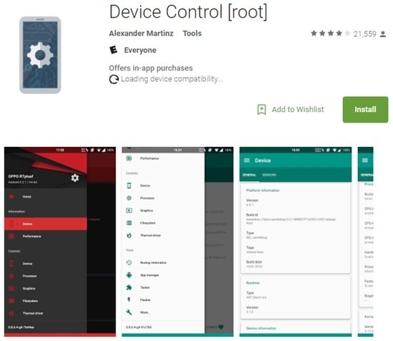 Device Control قادر است قابلیتهای مختلف گوشی شما را کنترل کرده و همچنین قابلیتهای اضافیتری شبیه به مدیر برنامه، ویرایشگر، Tasker، Entropy Generator، Wireless Filemanager را در اختیار شما قرار دهد. این برنامه اجازه میدهد فرکانس پردازنده مرکزی و گرافیکی را مشاهده کرده، مصرف برق السیدی را کاهش داده، قدرت ارتعاش را تنظیم کرده، بر ولتاژ شارژ نظارت کرده، ولتاژ سریع را پیکربندی کرده و کارهای مختلف دیگری را انجام دهید.