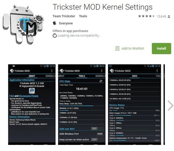 Trickster Mod این برنامه به شما اجازه میدهد تا گوشی خود را اورکلاک کرده و به قدرتی فراتر از حالت استاندارد دست پیدا کنید. برنامهای که گزینههای متعددی برای افزایش طول عمر باتری در اختیار شما قرار میدهد. از ویژگیهای این برنامه به نمایش وضعیت پردازنده مرکزی، نمایش فرکانس پردازنده، کنترل صدای پیشرفته، کنترل گاما پیشرفته برای N4 از طریق وصله faux، بوتلودر برای قفل کردن و از قفل خارج کردن بدون نیاز به بوت سریع، تنظیم قدرت ارتعاش، افزایش کارایی صدا و.... اشاره کرد.