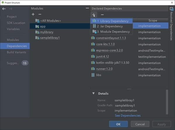 دکمه Next را کلیک کنید، فیلدهای مربوطه را پر کرده و دکمه finish را کلیک کنید. صبر کنید تا اندروید استودیو فرآیند پردازش را کامل کند تا بتوانید کتابخانه اندرویدی ساخته شده را در پنل  پروژه در سمت چپ تصویر مشاهده کنید. برای دسترسی به ساختار پروژه کلیدهای Ctrl+Alt+Shfit+S را فشار دهید. گزینه dependencies در سمت چپ را کلیک کنید و گزینه select app را انتخاب کنید. در مرحله بعد دکمه + درون وابستگی‌های اعلان شده را کلیک کنید و نگاهی به آن‌ها داشته باشید.