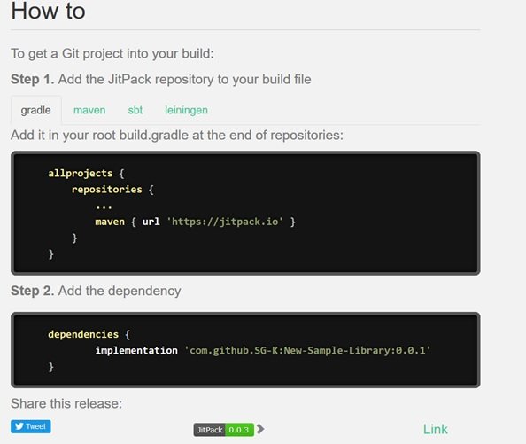 implementation 'com.github.SG-K:New-Sample-Library:0.0.1'