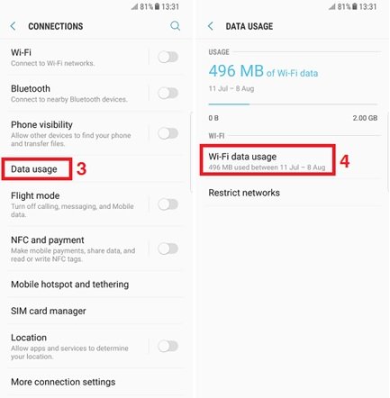 گام دوم، اکنون گزینه Data usage را انتخاب کرده و در ادامه گزینه Wi-Fi data usage را انتخاب کنید.