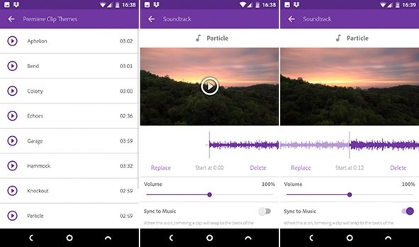 زمانی که فرآیند ویرایش کلیپها به پایان رسید اکنون زمان اضافه کردن موسیقی است. دکمه Soundtrack که در بالای صفحه قرار دارد را لمس کنید. شبه به علامت موسیقی است.