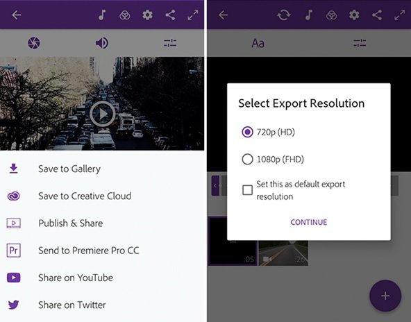 پس از انجام ویرایشهای موردنظر آیکن مربوط به تمامصفحه کردن که در سمت راست قرار دارد را لمس کرده تا پیشنمایش از ویدیوی نهایی را مشاهده کنید. اگر همه چیز دکمه به اشتراکگذاریگذاری را انتخاب، گزینهای که برای ذخیرهسازی مدنظر دارید را مشخص کرده، تفکیکپذیری را تعیین کرده و دکمه Continue را لمس کنید.