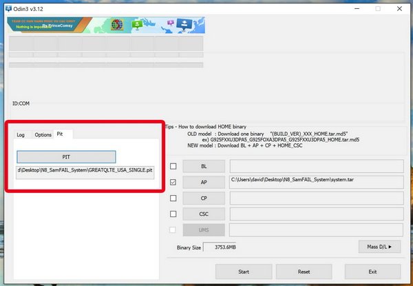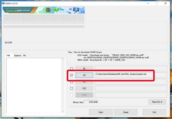 5. در اپلیکیشن Odin روی دکمه AP کلیک کرده و فایل system.tar را از فولدر تازه استخراج شده SamFail System انتخاب کنید.