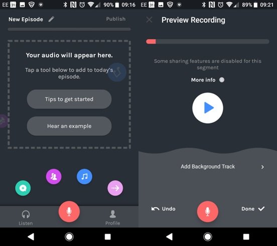 Podbean یکی دیگر از برنامههای موبایلی است که برای ضبط پادکستها در اختیار شما قرار دارد. این برنامه رایگان بوده اما برای دسترسی به خدمات هاستینگ آن باید هزینهای را پرداخت کنید. این برنامه به سادگی قابل استفاده است و اجازه میدهد به کتابخانه پادکستهای Podbean دسترسی داشته باشید. دکمه ضبط صدا فقط روی صفحه پروفایل خودتان یا در صفحه هوم قابل مشاهده است. البته برای آنکه بتوانید از این برنامه استفاده کنید ابتدا باید به سرویس مربوطه وارد شوید. (در آن ثبت نام کنید.) این برنامه یکسری ویرایشهای اولیه در اختیارتان قرار داده و اجازه میدهد یک پادکست را همراه با موسیقی پسزمینه ضبط کنید. این قابلیت به ویژه در زمانهایی مناسب است که دوست دارید صداهای محیطی را کم کنید. زمانی که ضبط به پایان رسید، باید یک مکان برای ذخیرهسازی پادکست خود انتخاب کنید. در نتیجه برای ذخیرهسازی پادکست به فضای خاصی محدود نیستید.