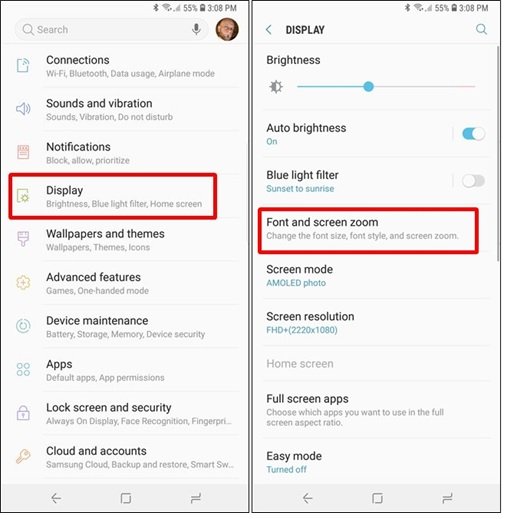در ادامه آیکن Display را لمس کرده و گزینه Screen zoom and font را انتخاب کنید.