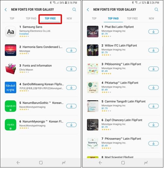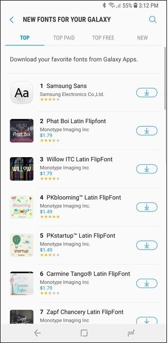 با اینکار به فروشگاه Galaxy Apps وارد میشوید که در آن میتوایند فونتهای جذابی که سامسونگ ارائه میکند را مشاهده کنید. البته برای استفاده از یکسری فونتهای جذاب این بخش باید هزینه آنرا پرداخت کنید!