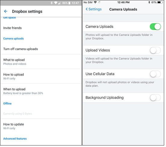 دراپپاکس از جمله سرویسهایی است که با گذشت زمان هنوز هم جزء برترینهای این حوزه بوده و از سوی بسیاری از کاربران که در نظر دارند از دادههای خود در فضای کلاود نسخه پشتیبان تهیه کنند مورد استفاده قرار میگیرد. دراپباکس سرویسی در ارتباط با پشتیبانگیری از تصاویر در اختیار کاربران قرار میدهد. سرویسی که قابلیتهای قابل قبولی دارد. اما قابلیتهایی که ارائه میکند یکسان با گوگل فوتوز نیست. در نتیجه در ارتباط با فضای ذخیرهسازی روی دراپباکس با محدودیتهایی روبرو هستید. دراپباکس از یک مکانیزم ساده برای پشتیبانگیری از تصاویر استفاده میکند. دراپباکس قابلیتی به نام Camera Uploads در اختیار کاربران قرار میدهد که از طریق منوی تنظیمات برنامه دراپباکس در دسترس است.