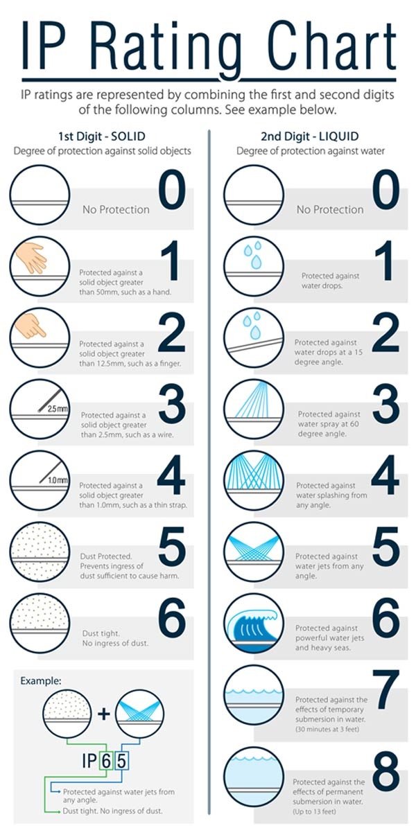با توصیف بالا بهطور مثال، مقدار IP65 نشان میدهد گجت در برابر نفوذ گردوغبار و همچنین نفوذ آب زمانی که از همه جهت آب پاشیده میشود ایمن است.