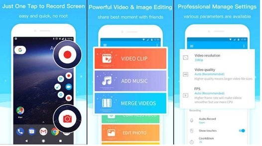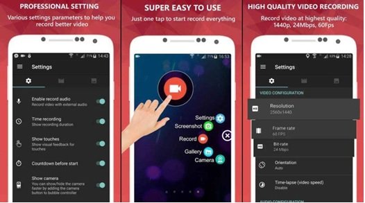 Super Screen Recorder یک برنامه فیلمبرداری ایدهآل است که مزیت بزرگ آن در رابط کاربری دوستانه و قابلیتهای ویرایشی قدرتمندی است که ارائه میکند. از این برنامه بدون روت کردن گوشی خود میتوانید استفاده کنید و همچنین هیچگونه محدودیت زمانی برای ضبط اعمال نمیکند. امکان فیلمبرداری با کیفیت بالا، تفکیکپذیری مختلف، نرخ فریم و نرخ بیت متفاوت از دیگر ویژگیهای این برنامه است. Facecam، GIF Maker و قلممو از جمله ابزارهایی هستند که برای کار کردن روی کلیپها و تهیه آنها میتوانید از آنها استفاده کنید. همچنین به شما اجازه میدهد واترمارک را به شکل دستی روی فیلمها اضافه کنید.