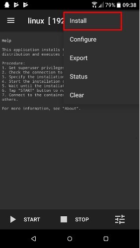 اکنون که تنظیمات اولیه را تعیین کردهاید به صفحه اصلی Linux Deploy بروید. منوی سه نقطه که در گوشه بالای صفحه قرار دارد را لمس کرده و گزینه Install را انتخاب کنید.