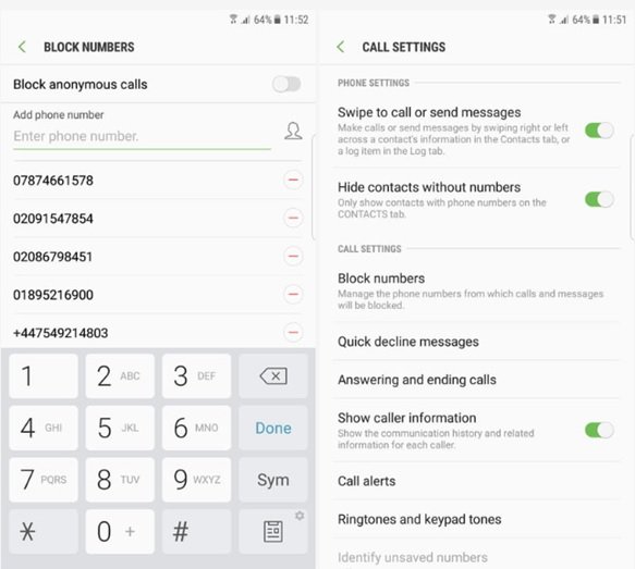 اگر مالک یک گوشی سامسونگی همچون اس 9 پلاس یا سایر گوشیهای ساخت سامسونگ هستید، مسدود کردن تماسها به سادهترین شکل امکانپذیر است. کافی است آیکن Phone روی صفحه اصلی را لمس کرده و سپس سه نقطهای که در گوشه سمت راست بالای صفحه قرار دارد را لمس کنید. در ادامه گزینه Settings را لمس کنید. اکنون گزینه Block numbers را انتخاب کنید. اکنون به صفحهای وارد میشوید که در بخش Add number phone باید شماره موردنظر را وارد کنید تا به فهرست سیاه وارد شود. همچنین اگر به دنبال آن هستید تا تماسهای ناشناس را نیز مسدود کنید، کافی است در همین صفحه گزینهBlock unknown callers را انتخاب کنید.