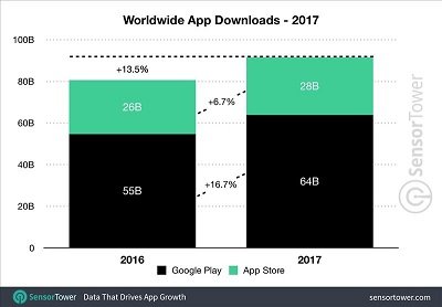 درحالیکه در سال 2016 میلادی پیشبینیشده بود، تعداد برنامههایی که برای اولین بار روی دستگاههای همراه کاربران نصب میشود به 80.7 میلیارد دانلود خواهد رسید، این رقم در سال گذشته میلادی به 91.5 میلیارد دانلود رسید که 13.5 درصد بیشتر از پیشبینیهای انجامشده بود. (شکل 2)
