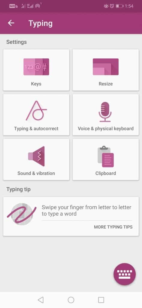 - سپس گزینه Typing را انتخاب کنید. در پنجره مربوط به این گزینه شما با شش گزینه دیگر “Keys”, “Resize”, “Typing & autocorrect”, “Voice & physical keyboard”, “Sound & vibration”, “Clipboard” مواجه خواهید شد.