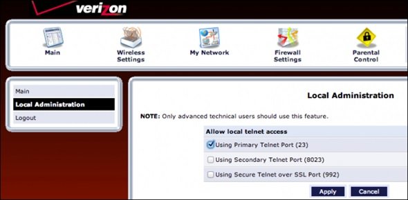 اولین کاری که باید انجام دهید بررسی این موضوع است که Telnet روی روتر شما فعال است یا خیر. در اغلب روترها با مراجعه به مسیر Advanced و سپس Local Administration میتوانید از فعال بودن گزینه Using Primary Telnet Port اطمینان حاصل کنید. اگر فعال نیست آنرا فعال کرده و روی دکمه Apply کلیک کنید.