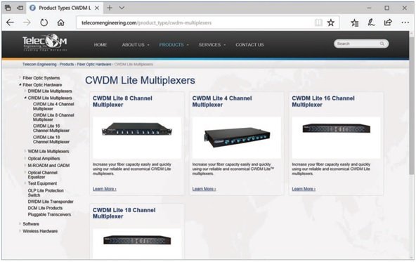 CWDM (تسهیمسازی با تقسیم طول موج غیرمتراکم) – در این مدل با عریضتر کردن فاصله باند فرکانسها برای تجهیزات فرستنده ارزان قیمت امکان کاهش هزینهها وجود دارد. تسهیمکنندگان WDM غیرمتراکم معمولا 4، 8، 16 یا 18 کانال در فیبر را پشتیبانی میکنند. فاصله موثر تسهیمسازی با تقسیم طول موج غیر متراکم محدود است، زیرا سیگنال تقویت نمیشود. مدل CWDM میتواند تا 16 طول موج با فاصله کانال 20 نانومتر را در محدوده طیف 1270 تا 1610 نانومتر انتقال دهد. شکل زیر تجهیزات CWDM در کلاسها 4، 8،16 و 18 کاناله را نشان میدهد.