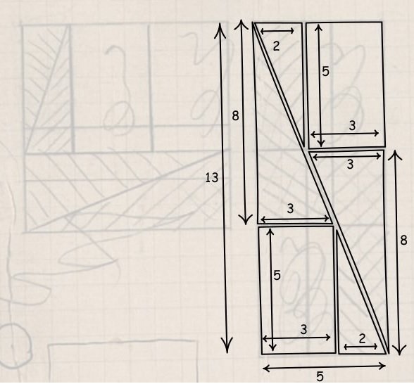 در این دفترچه یادداشت به معمای قدیمی مربع و مستطیل هاشور زده نیز اشاره شده است. معمایی که بیشتر به معماری مربع گم شده مشهور است. این یک معمای قدیمی است که ما در آن اثبات میکنیم که یک مربع با اندازه 8x8=64 خانه میتواند به قطعاتی تقسیم شود و دومرتبه سرهم شده و یک مستطیل 13x5=65 خانه را تشکیل دهد. بهطوری که ما ثابت میکنیم که 65=64 است.
