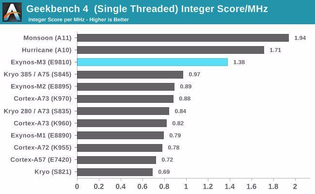 در حالت معمول، تراشهها به تنهایی کلاک نمیکنند. آزمون بعدی، به بررسی فرکانس پردازشی در حالت عادی میپردازد که باز هم Apple A11 و تراشه نسل قبلش، یعنی Apple A10 نمرات بهتری نسبت به تراشه جدید سامسونگ کسب کردهاند.