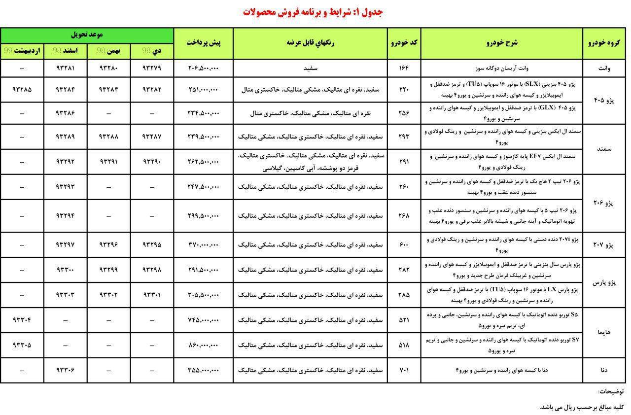 جدول شماره 1 شرایط فروش و پیشفروش ایرانخودرو بمناسبت دهه فجر - بهمن 97