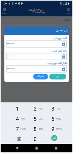 مطابق شکل زیر کلمه عبور فعلی و جدید را در بخش های مرتبط وارد نموده و گزینه تایید را انتخاب کنید. با این کار کلمه عبور جدید در برنامه تعریف می شود.