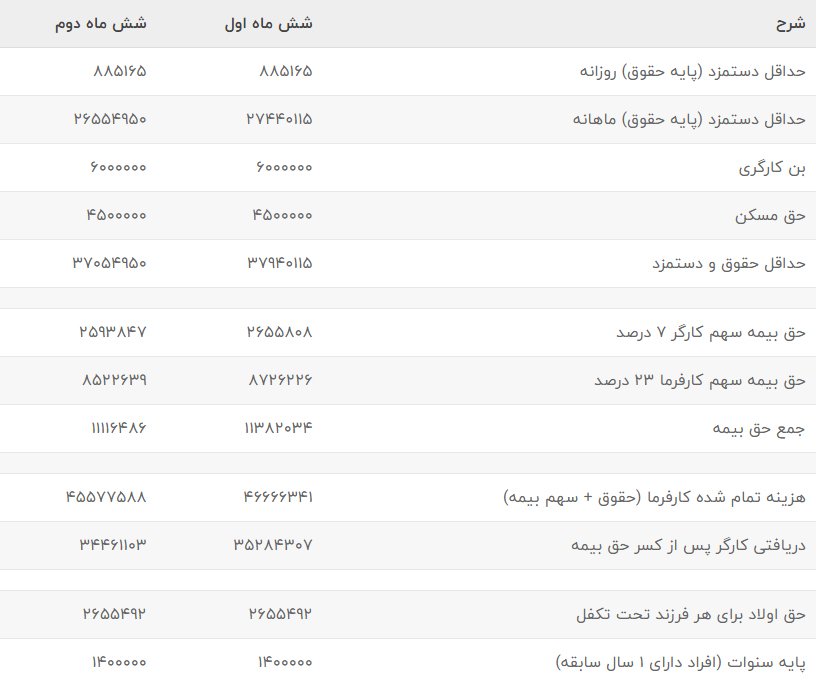 با توجه به تعیین و اعلام حداقل دستمزد کارگران در سال 1400 و همچنین تغییر مبلغ حق مسکن و خوار و بار، مبلغ حق بیمههای سهم کارگر و کارفرما به شرح زیرمی باشد: