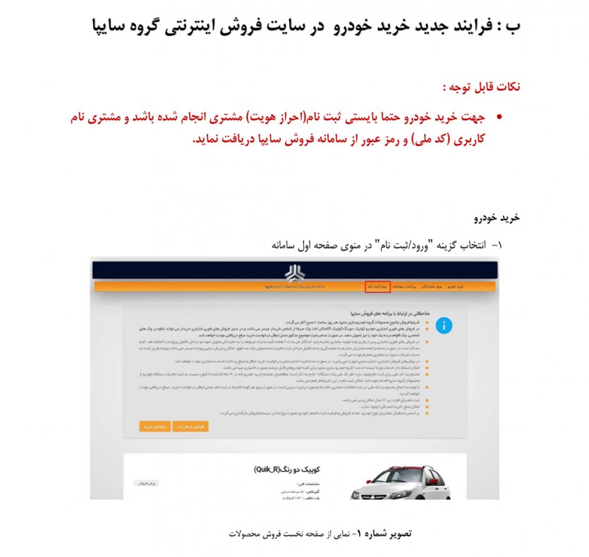 - مشتري نام كاربري (كد ملي) و رمز عبور از سامانه فروش سايپا saipa.iranecar.com دريافت نمايد.