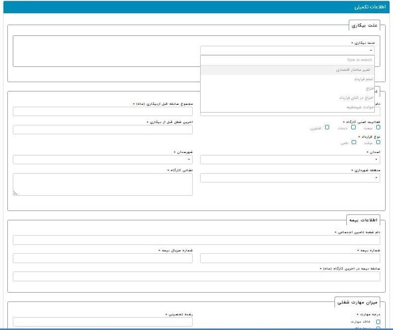 - باز شدن صفحه درخواست در قسمت اطلاعات تکمیلی «علت بیکاری» از بین موارد تعیین شده انتخاب شود.